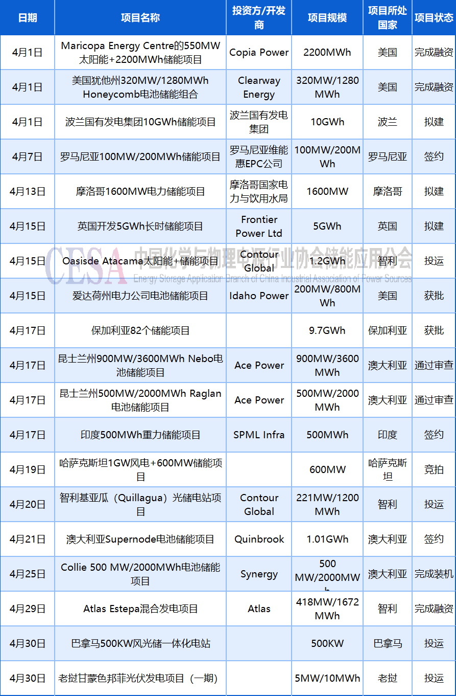 中國儲能網(wǎng)訊:2025年4月,CESA儲能應(yīng)用分會產(chǎn)業(yè)數(shù)據(jù)庫追蹤到18起海外儲能項(xiàng)目建設(shè)動(dòng)態(tài)事件,總規(guī)模超43.97GWh,涉及Contour Global、Ace Power、Ace Power、Frontier Power Ltd、SPML Infra、Copia Power、Clearway Energy、摩洛哥國家電力與飲用水局、波蘭國有發(fā)電集團(tuán)、Atlas等全球能源投資方/開發(fā)商,建設(shè)地點(diǎn)位于保加利亞、智利、澳大利亞、英國、印度、美國、摩洛哥、波蘭、智利等國家。