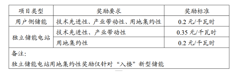 根據(jù)實(shí)際放電量給予獎勵。具備技術(shù)先進(jìn)性、產(chǎn)業(yè)帶動性、用地集約性的用戶側(cè)儲能:0.2元/千瓦時。具備技術(shù)先進(jìn)性、產(chǎn)業(yè)帶動性的獨(dú)立儲能電站:0.35元/千瓦時。具備技術(shù)先進(jìn)性、產(chǎn)業(yè)帶動性、用地集約性的獨(dú)立儲能電站:對“入樓”部分儲能電池額外獎勵0.2元/千瓦時。每千瓦時儲能容量的年電量獎勵上限600千瓦時,獎勵期3年。