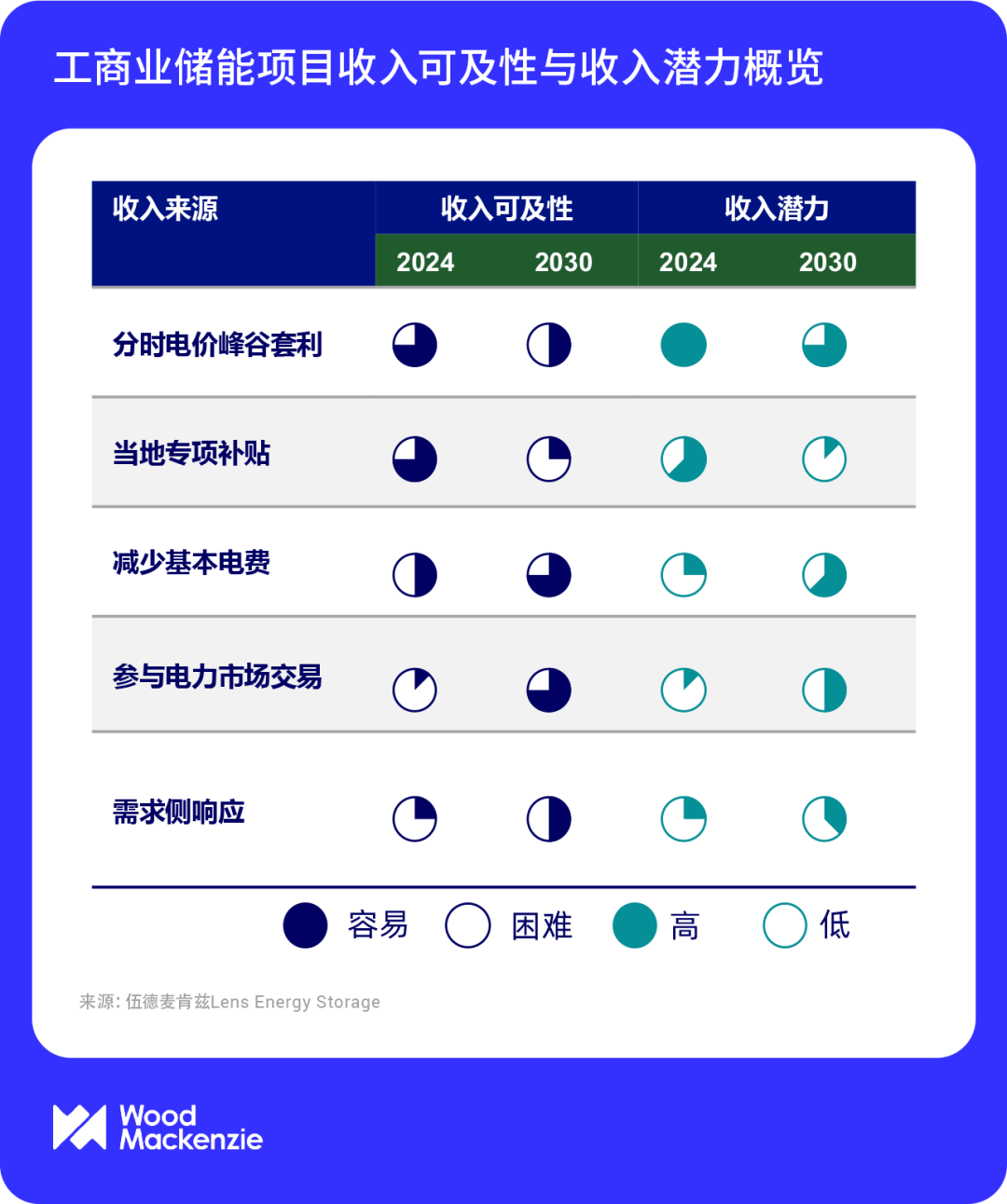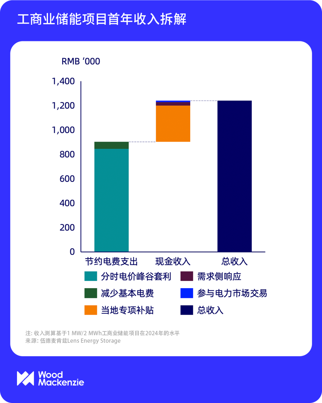 目前,工商業(yè)儲能項目的收入來源主要來自于以下五個渠道,包括分時電價峰谷套利、當(dāng)?shù)貙m椦a貼、減少基本電費、參與需求側(cè)響應(yīng)和參與電力市場交易。伍德麥肯茲對項目收益的調(diào)研和測算顯示:在2024年,分時電價峰谷套利和當(dāng)?shù)貙m椦a貼是最主要的兩大收入來源,貢獻了約90%的首年收入,且在全生命周期中占比高達40%。在項目運營早期優(yōu)先保障這兩項收入來源是快速回收投資的關(guān)鍵策略。