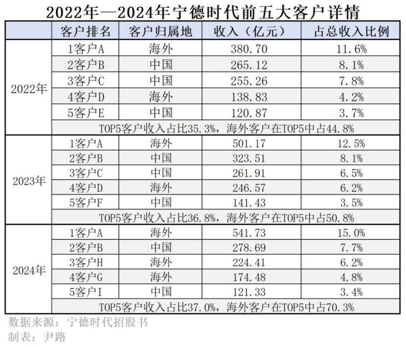海外市場(chǎng)已經(jīng)成為寧德時(shí)代的關(guān)鍵增長(zhǎng)極,2018年—2024年,其境外營(yíng)收從不足10億元增至千億元以上,遠(yuǎn)超境內(nèi)營(yíng)收增速。到2023年,境外營(yíng)收占比穩(wěn)定在30%以上,且2020年之后境外業(yè)務(wù)毛利率持續(xù)超出境內(nèi)業(yè)務(wù)5個(gè)百分點(diǎn)左右。2024年,寧德時(shí)代前五大客戶中海外客戶已占據(jù)三席。