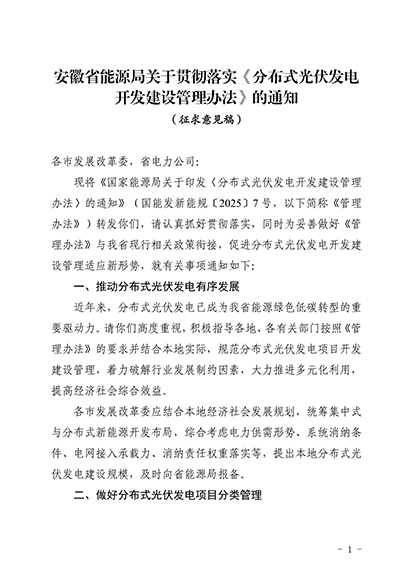 中國(guó)儲(chǔ)能網(wǎng)訊:5月20日,安徽省能源局發(fā)布《關(guān)于貫徹落實(shí) (分布式光伏發(fā)電開發(fā)建設(shè)管理辦法〉的通知(征求意見稿)》。