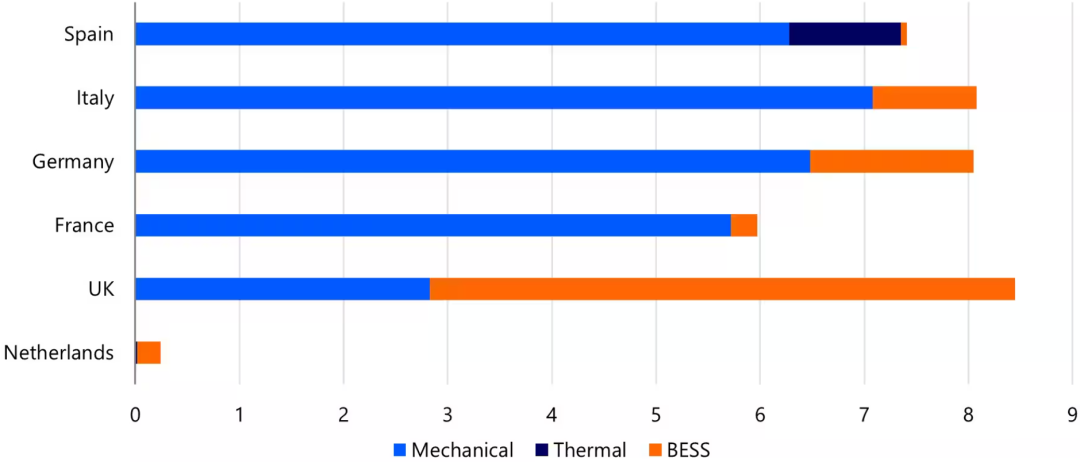 就整體儲(chǔ)能裝機(jī)容量而言,西班牙是歐洲領(lǐng)先國家之一(見圖2)。目前,西班牙已安裝6.3GW水電儲(chǔ)能和1GW熱力儲(chǔ)能,其非BESS儲(chǔ)能規(guī)模高于任何其他歐洲國家。因此,西班牙對(duì)BESS整合可再生能源的需求不如英國等國緊迫。