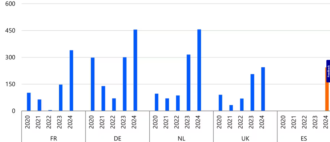 隨著條件改善,西班牙BESS項(xiàng)目儲(chǔ)備逐步增加。2025年3月,英國公司Renewco和Atlantica宣布在西班牙開發(fā)2.2GWBESS項(xiàng)目,其他項(xiàng)目多為風(fēng)光配套儲(chǔ)能。