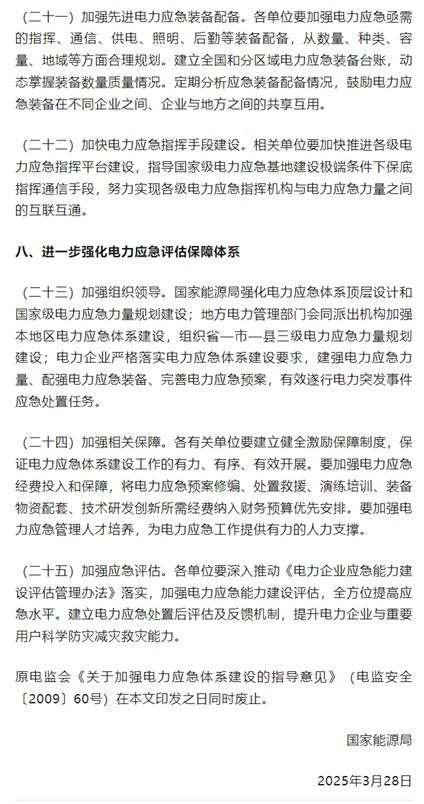 中國儲能網(wǎng)訊:在“雙碳”目標與能源革命的浪潮中,中國儲能產(chǎn)業(yè)正迎來黃金發(fā)展期。5月20日,國家能源局重磅發(fā)布《關(guān)于進一步加強電力應急體系和能力建設(shè)的指導意見》,為儲能技術(shù)的大規(guī)模商業(yè)化應用按下加速鍵。這份文件不僅勾勒出電力應急體系建設(shè)的清晰路徑,更從政策扶持、標準制定、技術(shù)創(chuàng)新、市場培育等多方面,為儲能產(chǎn)業(yè)鋪就了一條高速發(fā)展的新賽道。