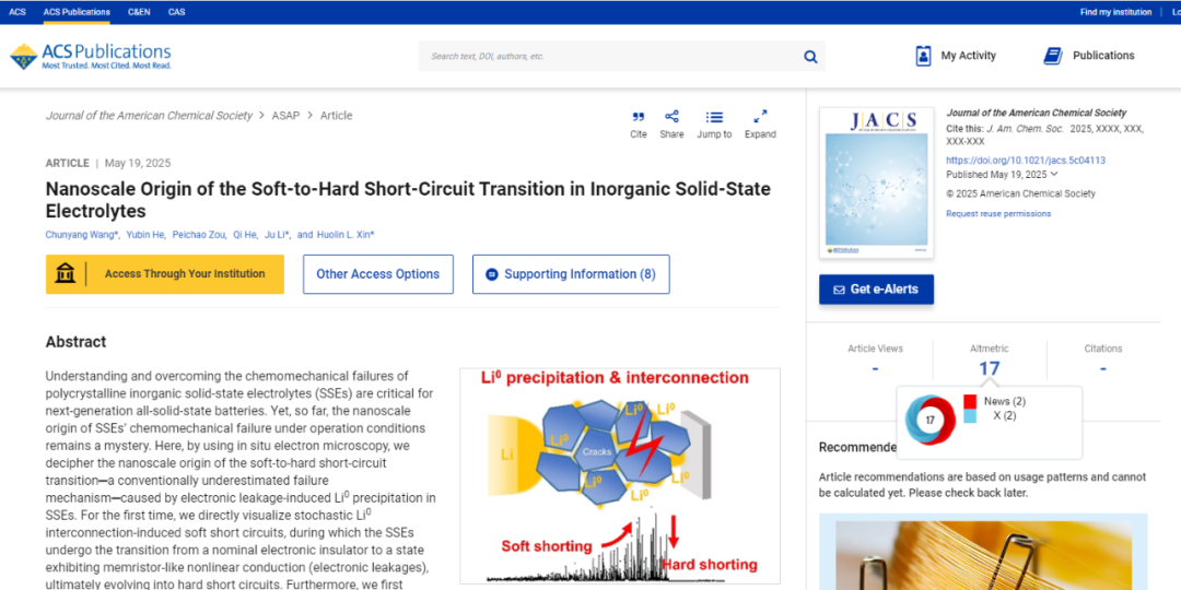 中國(guó)儲(chǔ)能網(wǎng)訊:據(jù)新華社和央視新聞5月21日?qǐng)?bào)道,近日,中國(guó)科學(xué)院金屬研究所沈陽(yáng)材料科學(xué)國(guó)家研究中心研究員王春陽(yáng)聯(lián)合國(guó)際團(tuán)隊(duì),利用原位透射電鏡技術(shù)在納米尺度首次揭開(kāi)了固態(tài)電池突發(fā)短路成因,并提出相應(yīng)對(duì)策,研究成果5月20日發(fā)表在《美國(guó)化學(xué)會(huì)會(huì)刊》(Journal of the American Chemical Society,簡(jiǎn)稱(chēng) JACS)上。