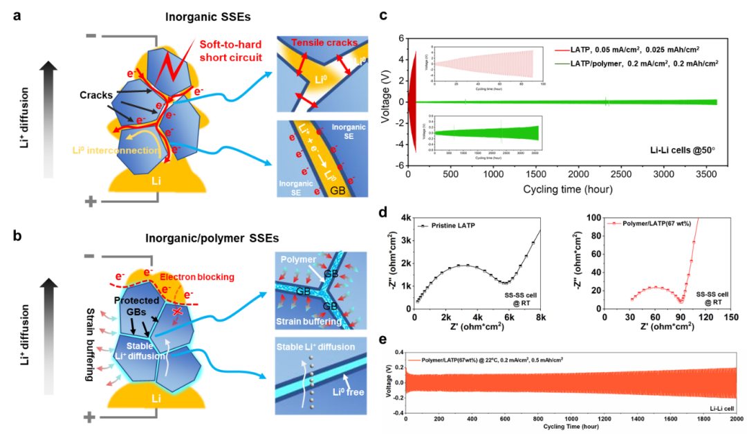 基于這些發(fā)現(xiàn),研究團(tuán)隊(duì)利用具有機(jī)械柔性且電子絕緣的三維聚合物網(wǎng)絡(luò),發(fā)展了“剛?cè)岵?jì)”的無(wú)機(jī)-有機(jī)復(fù)合固態(tài)電解質(zhì),有效抑制了固態(tài)電解質(zhì)內(nèi)部的鋰金屬析出、互連及其誘發(fā)的短路失效。