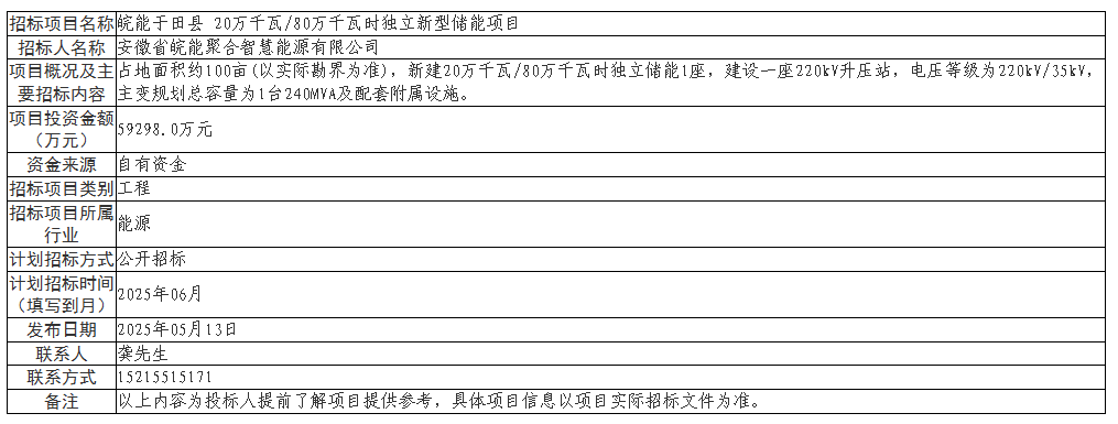 中國儲能網(wǎng)訊:5月13日,皖能新疆于田縣200MW/800MWh獨立新型儲能項目招標發(fā)布,招標人為安徽省皖能聚合智慧能源有限公司,項目投資金額為59298.0萬元,折合單價0.74元/Wh。