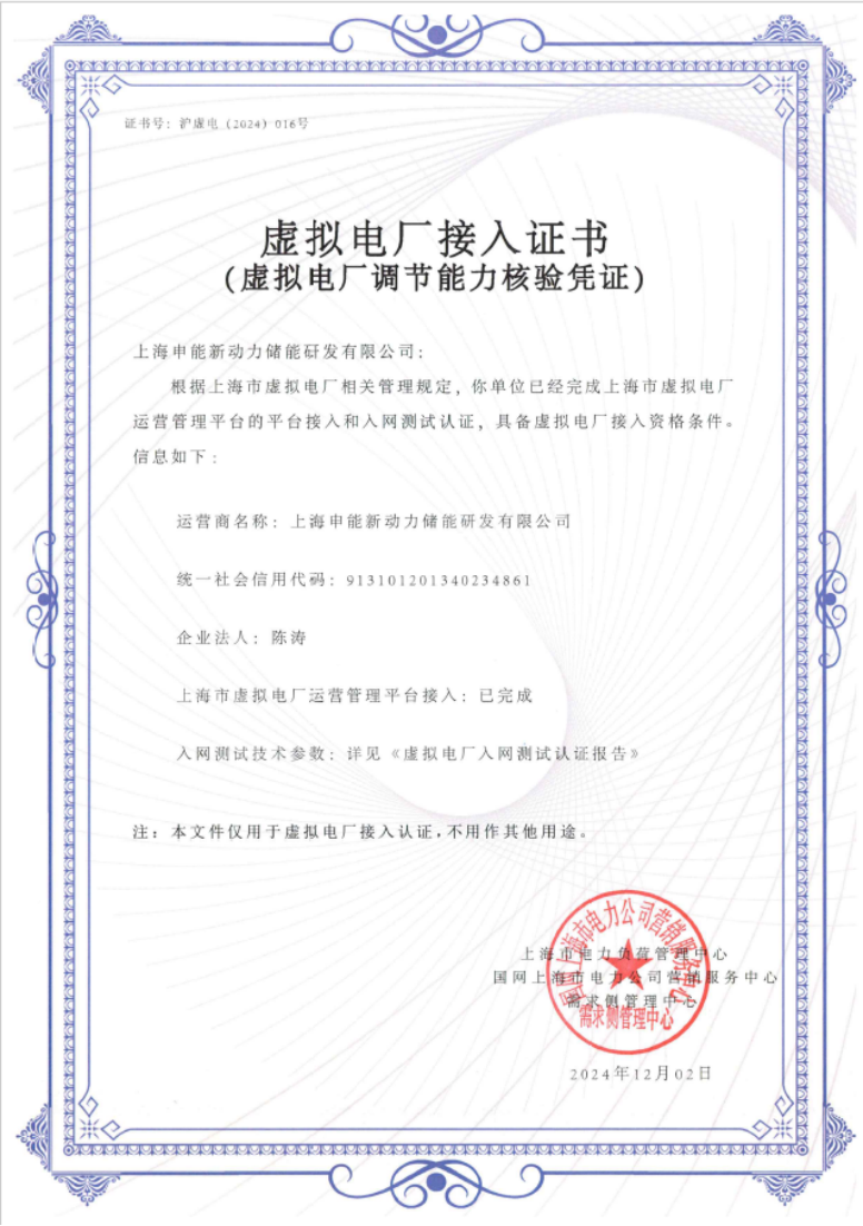 2024年,為規(guī)范虛擬電廠注冊(cè)及運(yùn)行流程,上海電力交易中心發(fā)布《上海市虛擬電廠注冊(cè)指引(試行)》文件,虛擬電廠運(yùn)營(yíng)商需通過(guò)電網(wǎng)負(fù)荷管理中心或電網(wǎng)調(diào)控中心安排專(zhuān)業(yè)資質(zhì)檢測(cè)并獲取相應(yīng)報(bào)告。申能儲(chǔ)能迅速響應(yīng)號(hào)召,8月14日配合電網(wǎng)開(kāi)展測(cè)試,采用云邊結(jié)合形式,當(dāng)日便通過(guò)專(zhuān)業(yè)機(jī)構(gòu)檢測(cè),并于12月2日獲取《虛擬電廠調(diào)節(jié)能力核驗(yàn)憑證》(見(jiàn)圖2)及《虛擬電廠入網(wǎng)測(cè)試認(rèn)證報(bào)告》,成為上海市首批獲得調(diào)節(jié)能力校驗(yàn)憑證的負(fù)荷聚合商。