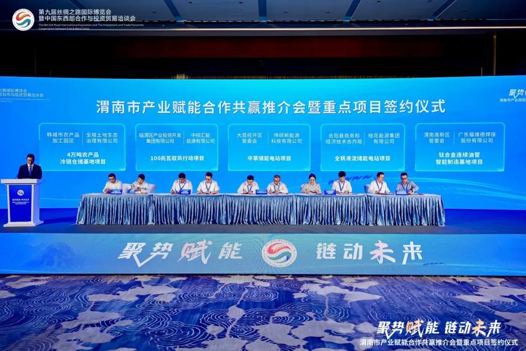 中國儲能網(wǎng)訊:5月21日,在第九屆絲博會召開之際,渭南市產(chǎn)業(yè)賦能合作共贏推介會暨重點項目簽約儀式在西安舉行,渭南市委書記樊維斌、市長陳曉勇等出席活動。會上,陜西桂花能源集團(tuán)有限公司作為新型儲能領(lǐng)域的領(lǐng)軍企業(yè),與渭南市合陽縣正式簽約合陽縣80MW/320MWh全釩液流儲能電站項目。