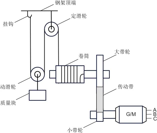 系統(tǒng)主要由質(zhì)量塊、發(fā)電/電動(dòng)機(jī)、傳動(dòng)裝置、曳引裝置和鋼架五大部分組成,其中傳動(dòng)裝置由大帶輪、傳動(dòng)帶和小帶輪組成,曳引裝置則由卷筒和鋼絲繩組成。質(zhì)量塊是重力勢(shì)能的儲(chǔ)存單元,發(fā)電/電動(dòng)機(jī)是系統(tǒng)進(jìn)行機(jī)電能量轉(zhuǎn)換的核心,而傳動(dòng)裝置用于在高轉(zhuǎn)速、小轉(zhuǎn)矩的電機(jī)側(cè)與低轉(zhuǎn)速、大轉(zhuǎn)矩的機(jī)械側(cè)之間建立聯(lián)系,曳引裝置用于執(zhí)行質(zhì)量塊的升降,鋼架的高度則決定了質(zhì)量塊升降的最大高度差。