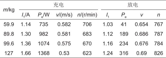 在得到機(jī)械環(huán)節(jié)綜合效率的基礎(chǔ)上,針對(duì)一臺(tái)1.1 kW、380 V、4對(duì)極、定子△接的籠型異步電機(jī),根據(jù)其機(jī)械特性和系統(tǒng)各部分之間的速度關(guān)聯(lián)關(guān)系,得到充電時(shí)電機(jī)轉(zhuǎn)差率為0.14,轉(zhuǎn)速為645 r/min,質(zhì)量塊運(yùn)行速度為0.542 m/s,并得到對(duì)應(yīng)的滑輪損耗為83.93 W,曳引損耗為40.02 W,傳動(dòng)損耗為14.8 W;放電時(shí)電機(jī)的轉(zhuǎn)差率為-0.068,轉(zhuǎn)速為801 r/min,質(zhì)量塊運(yùn)行速度為0.694 m/s,對(duì)應(yīng)的系統(tǒng)滑輪損耗為96.76 W,曳引損耗為38.46 W,傳動(dòng)損耗為9.48 W。