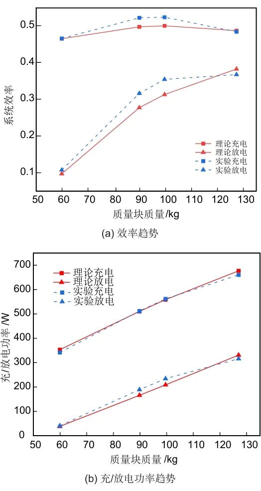 根據(jù)實(shí)驗(yàn)數(shù)據(jù)對(duì)計(jì)算不同質(zhì)量塊質(zhì)量下的系統(tǒng)充/放電效率及功率,與理論結(jié)果比較,如圖4所示。