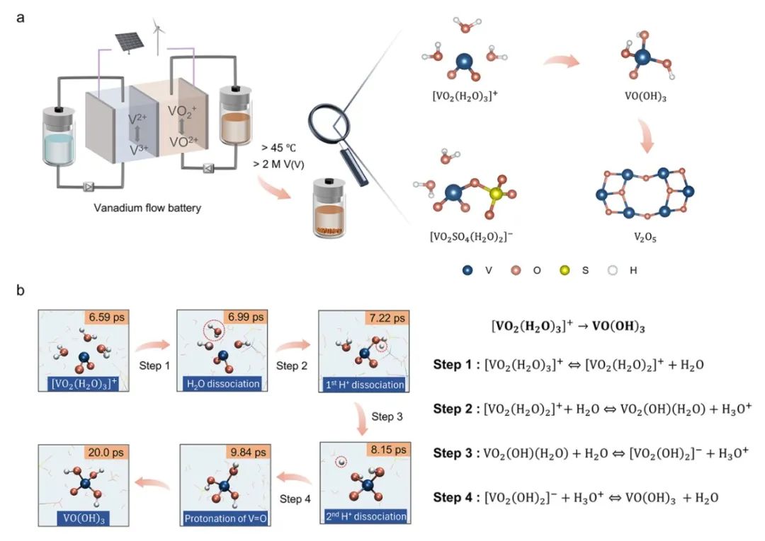 針對這一關鍵科學問題,研究團隊結合從頭算分子動力學(AIMD)模擬與原位液體飛行時間二次離子質譜(in situ liquid ToF-SIMS)表征技術,系統(tǒng)解析了V(V) 溶劑化結構從[VO2(H2O)3]+到 VO(OH)3的完整轉化過程。