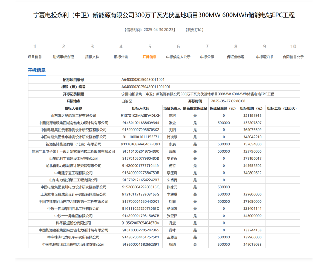 中國儲能網(wǎng)訊:5月27日,寧夏電投永利(中衛(wèi))新能源有限公司300萬千瓦光伏基地項目300MW/600MWh儲能電站EPC工程項目開標(biāo)。