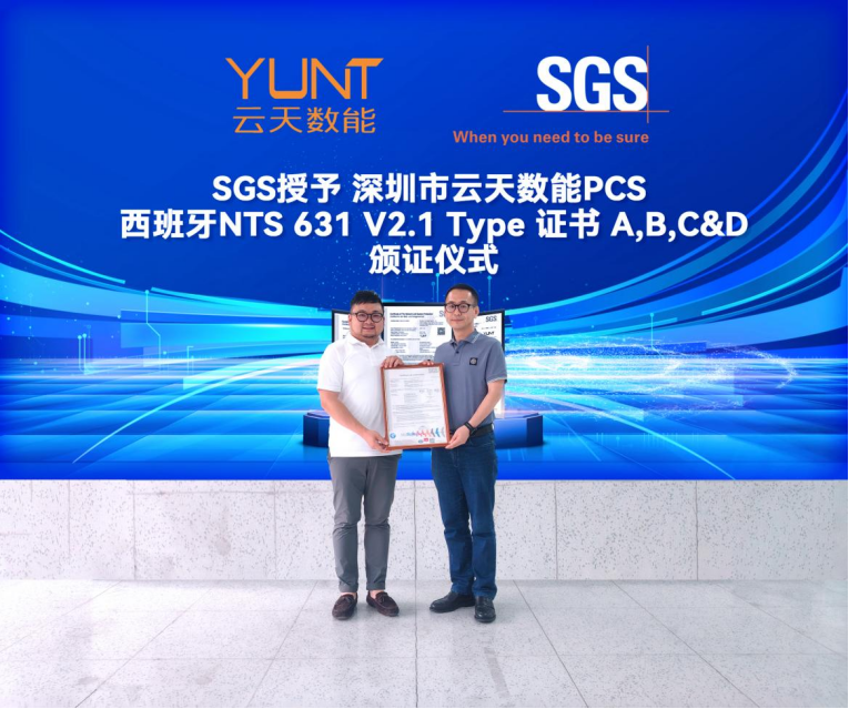 SGS為云天數(shù)字能源儲能并網(wǎng)逆變器頒發(fā)西班牙并網(wǎng)系列證書