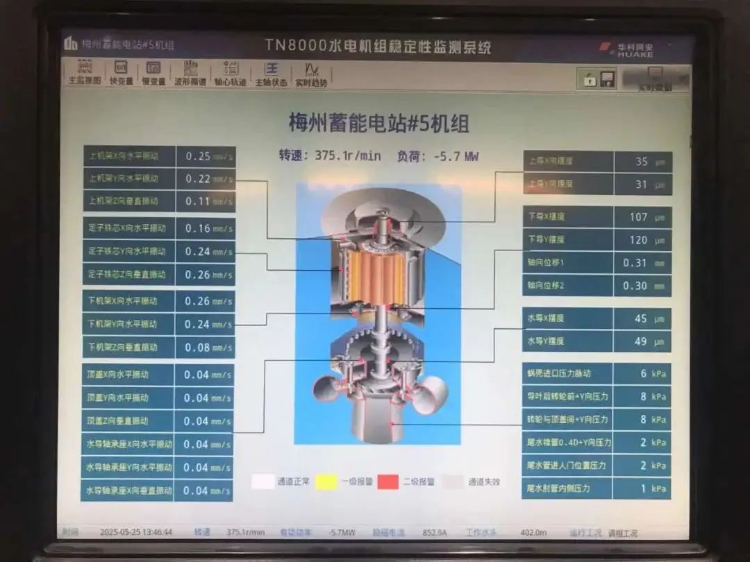 5號機(jī)組于5月25日13點(diǎn)31分完成抽水調(diào)相并網(wǎng)試驗(yàn),試驗(yàn)過程中壓水時(shí)間、氣罐壓力、機(jī)組振擺、瓦溫,噪音等穩(wěn)定指標(biāo)全部滿足要求,機(jī)組運(yùn)行平順、各輔助設(shè)備運(yùn)行穩(wěn)定。