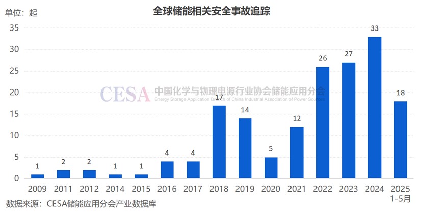 馬斯克X數(shù)據(jù)中心的火災(zāi)事件并非孤例,隨著全球能源轉(zhuǎn)型提速與儲能產(chǎn)業(yè)的迅猛擴張,儲能相關(guān)事故發(fā)生頻率呈上升趨勢。據(jù)CESA儲能應(yīng)用分會產(chǎn)業(yè)數(shù)據(jù)庫不完全統(tǒng)計,僅2025年1-5月,全球就新增了18起儲能相關(guān)安全事故,其中英國5起,韓國4起,美國3起,德國和中國各2起,澳大利亞、西班牙各1起。