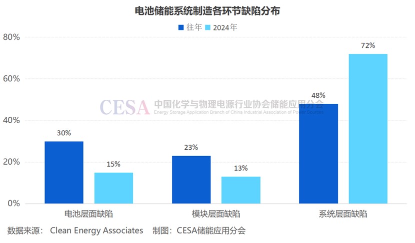 為有效遏制事故發(fā)生,我們須追根溯源,深入剖析各關(guān)鍵環(huán)節(jié)的質(zhì)量控制現(xiàn)狀。近日,美國Clean Energy Associates(CEA)發(fā)布了最新的BESS質(zhì)量風(fēng)險報告,該報告覆蓋了包括美國、中國、印度、越南、韓國在內(nèi)的全球70余家BESS制造工廠。數(shù)據(jù)顯示,2024年所識別的質(zhì)量缺陷中,15%源自電芯制造,13%出現(xiàn)在模組制造環(huán)節(jié),而高達72%的問題則集中在系統(tǒng)集成層面,遠高于往年48%的占比,系統(tǒng)集成正逐漸成為質(zhì)量控制的最大挑戰(zhàn)。