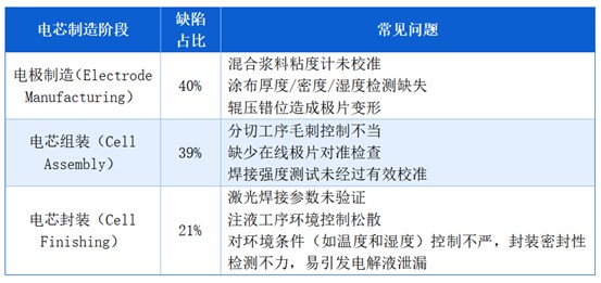 在電芯制造環(huán)節(jié),質(zhì)量問題主要集中在三個核心階段:40%的缺陷源于電極制造,39%出現(xiàn)在電芯組裝,另有21%發(fā)生于電芯封裝。其中,分切工序尤為值得關(guān)注,其缺陷發(fā)生率高達38%,為所有子工序中最高。該環(huán)節(jié)容易出現(xiàn)電極毛刺問題,一旦毛刺刺穿隔膜,極有可能引發(fā)熱失控,嚴重威脅電芯乃至整套儲能系統(tǒng)的安全性。