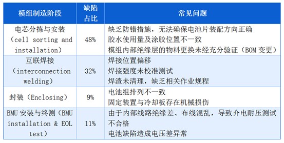 模組制造環(huán)節(jié)問題占比13%,由于其自動化程度普遍低于電芯制造,因此更容易出現(xiàn)材料處理不精確及焊接質(zhì)量不佳的問題。其中,電芯分揀與安裝工序問題最為突出,占模組制造缺陷的48%。該環(huán)節(jié)涵蓋多個關(guān)鍵操作步驟,包括手動和目視檢查外觀、清潔度、涂膠及夾具固定等。多數(shù)問題集中在涂膠環(huán)節(jié),例如涂膠區(qū)域不均勻或重量偏離標準操作規(guī)程(SOP)。