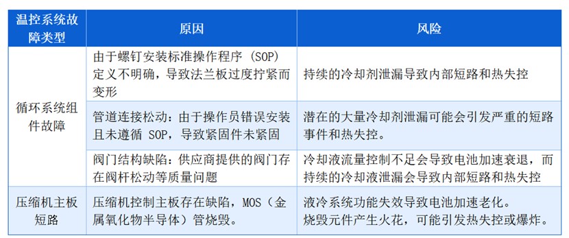 具體來看,64%的系統(tǒng)級缺陷與系統(tǒng)平衡有關(guān),問題通常源于組件缺陷或系統(tǒng)集成流程錯誤,例如,由于閥門故障、冷卻液循環(huán)系統(tǒng)內(nèi)管道連接松動而導(dǎo)致的液體冷卻液泄漏;內(nèi)部接線錯誤導(dǎo)致溫度、煙霧、氣體傳感器、聲光警報故障;交直流配電系統(tǒng)中帶電導(dǎo)體裸露,存在嚴重安全隱患。