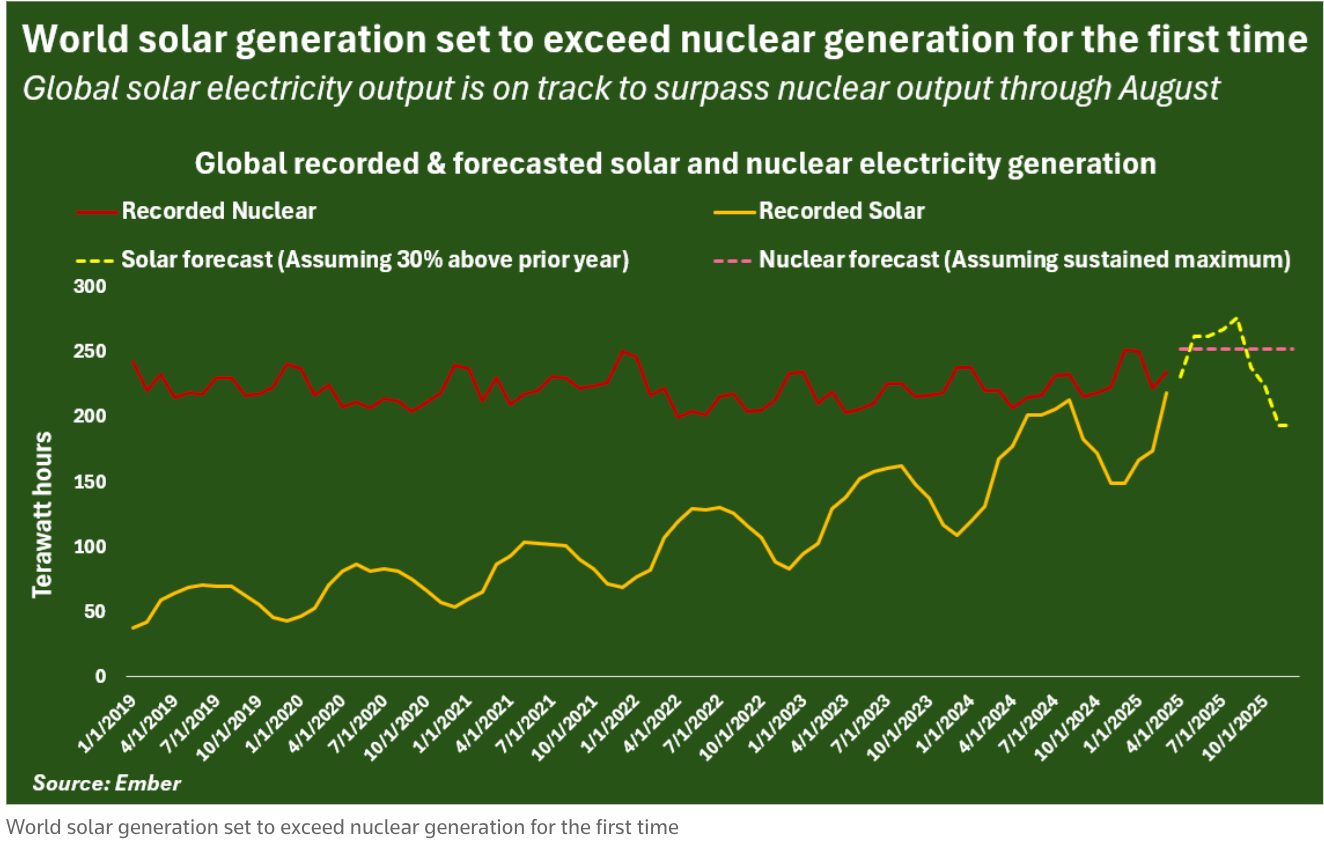 中國儲(chǔ)能網(wǎng)訊:路透社報(bào)道:今年夏季的3個(gè)月(6-8月)全球太陽能發(fā)電廠的發(fā)電量預(yù)計(jì)首次超過核電站的發(fā)電量,這標(biāo)志著太陽能在全球能源系統(tǒng)中持續(xù)增長的一個(gè)重要里程碑。但是,由于太陽能發(fā)電廠僅在白天發(fā)電,因此從年度發(fā)電量來看,太陽能發(fā)電量仍低于風(fēng)能、核能和水電系統(tǒng)。