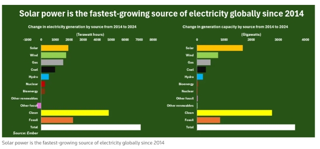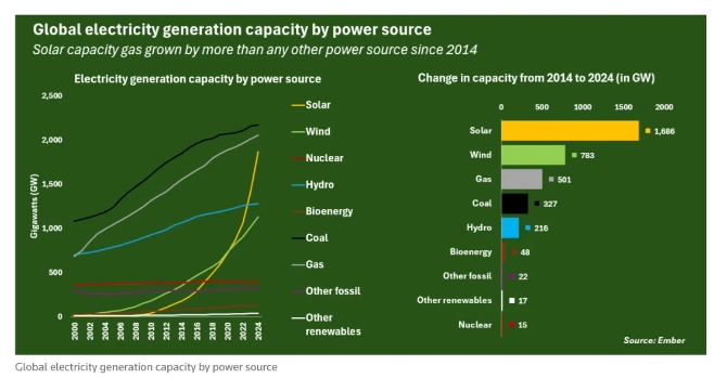 在過去十年中,公用事業(yè)公司在發(fā)電網(wǎng)絡(luò)中增加了兩倍多的太陽能發(fā)電能力,超過了其他任何電力來源,這主要得益于太陽能系統(tǒng)的相對低成本和快速連接時(shí)間。根據(jù)能源智庫Ember的數(shù)據(jù),截至2024年全球電力系統(tǒng)共有1866吉瓦(GW)的公用事業(yè)規(guī)模太陽能發(fā)電能力。該裝機(jī)規(guī)模是2014年產(chǎn)能的10倍,在此期間,在所有主要電力來源中,太陽能發(fā)電能力的增長遠(yuǎn)遠(yuǎn)超過了其他任何主要電力來源。 在過去的十年中,風(fēng)能發(fā)電的產(chǎn)能增長位居第二,增長了3.2倍,而所有其他發(fā)電來源的裝機(jī)容量增長均未超過兩倍。
