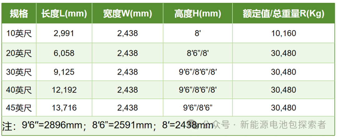 國(guó)際標(biāo)準(zhǔn)ISO 668中規(guī)定了集裝箱的規(guī)格尺寸,從10英尺到45英尺,甚至有49英尺、53英尺、60英尺等更大的尺寸可供選擇。其中,用于儲(chǔ)能系統(tǒng)的主要是20英尺和40英尺。目前,5MWh儲(chǔ)能系統(tǒng)為市場(chǎng)主流產(chǎn)品,多采用20英尺集裝箱。