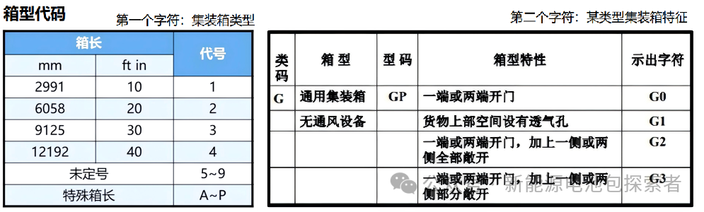 箱型代碼由兩個(gè)字符組成,第一個(gè)字符表示集裝箱類型;第二字符表示某類型集裝箱的特征。