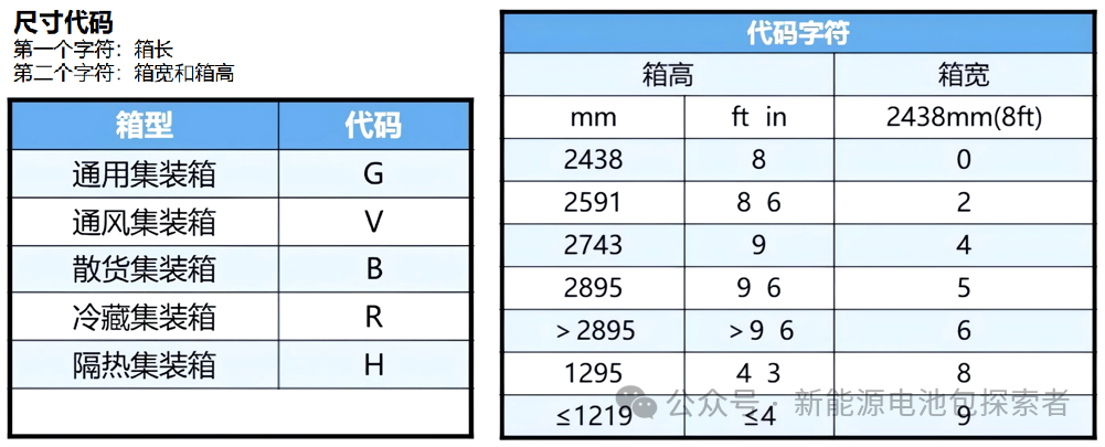 尺寸代碼也由兩個(gè)字符組成,第一個(gè)字符表示集裝箱長(zhǎng)度;第二字符表示集裝箱的寬度和高度。