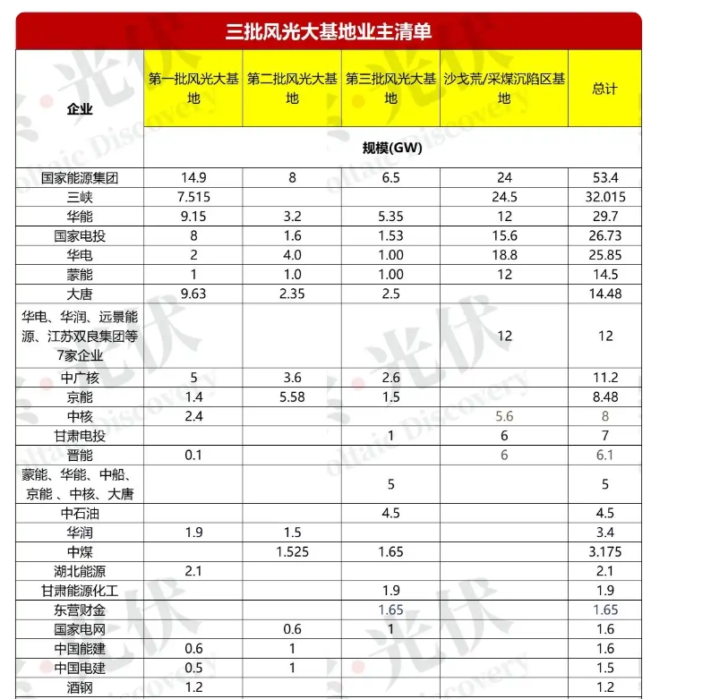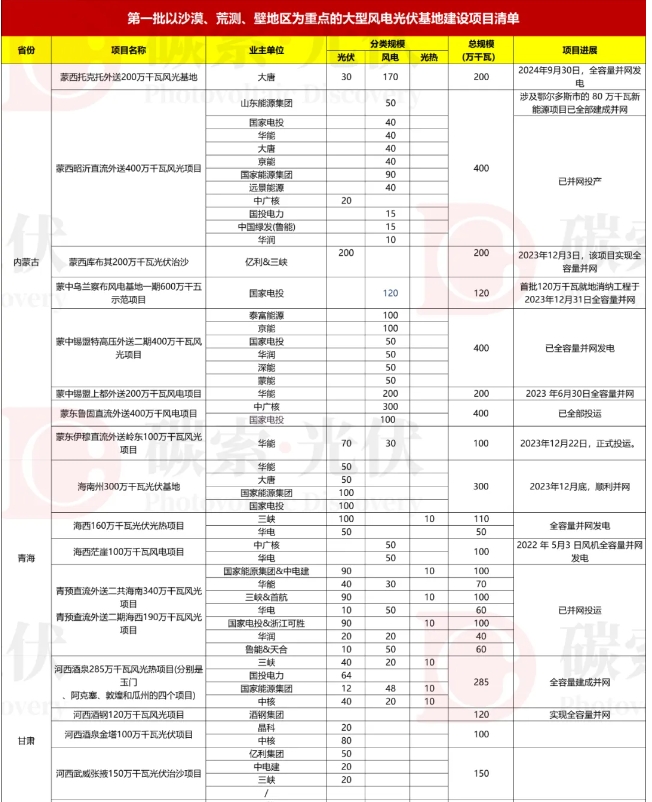 第一批:業(yè)主規(guī)模約97.05GW,項(xiàng)目已全部開工,絕大部分已并網(wǎng)。