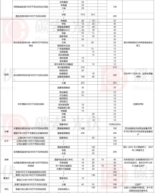 目前,首批基地項(xiàng)目已全面開工建設(shè),業(yè)主單位涵蓋國(guó)家能源集團(tuán)、華能、華電、國(guó)家電投、華潤(rùn)、大唐、三峽、中核、中廣核、蒙能、京能等多家央國(guó)企。