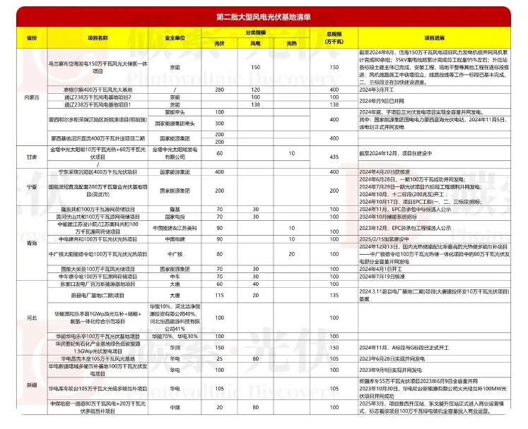 第二批:約43.18GW已明確業(yè)主規(guī)模,大部分項(xiàng)目處于開工、并網(wǎng)、備案等不同階段。