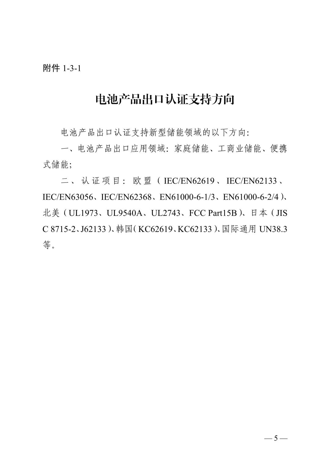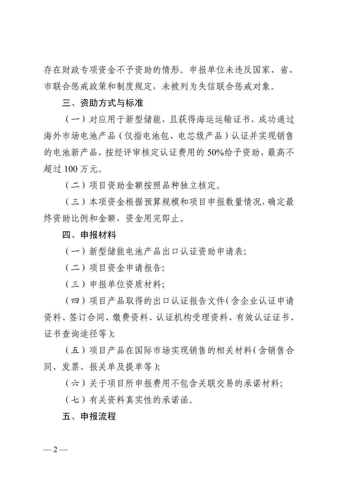 面向歐盟、美國、日韓等國際市場,首次取得應用于新型儲能領域的電池產(chǎn)品出口認證證書,且符合附件中的支持方向要求。對應用于新型儲能,且獲得海運運輸證書,成功通過海外市場電池產(chǎn)品(僅指電池包、電芯級產(chǎn)品)認證并實現(xiàn)銷售的電池新產(chǎn)品,按經(jīng)評審核定認證費用的50%給予資助,最高不超過100萬元。