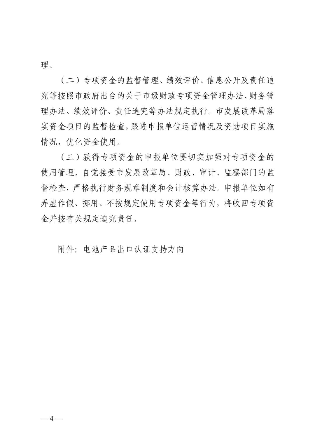 (一)資金的支持范圍主要包括:增資擴產(chǎn)貸款貼息資助、創(chuàng)新載體建設獎勵、電池產(chǎn)品出口認證資助、示范應用資助、公共服務平臺資助5個方面;