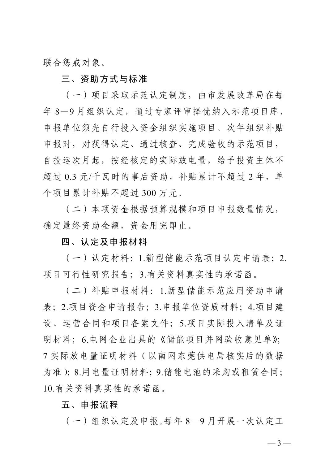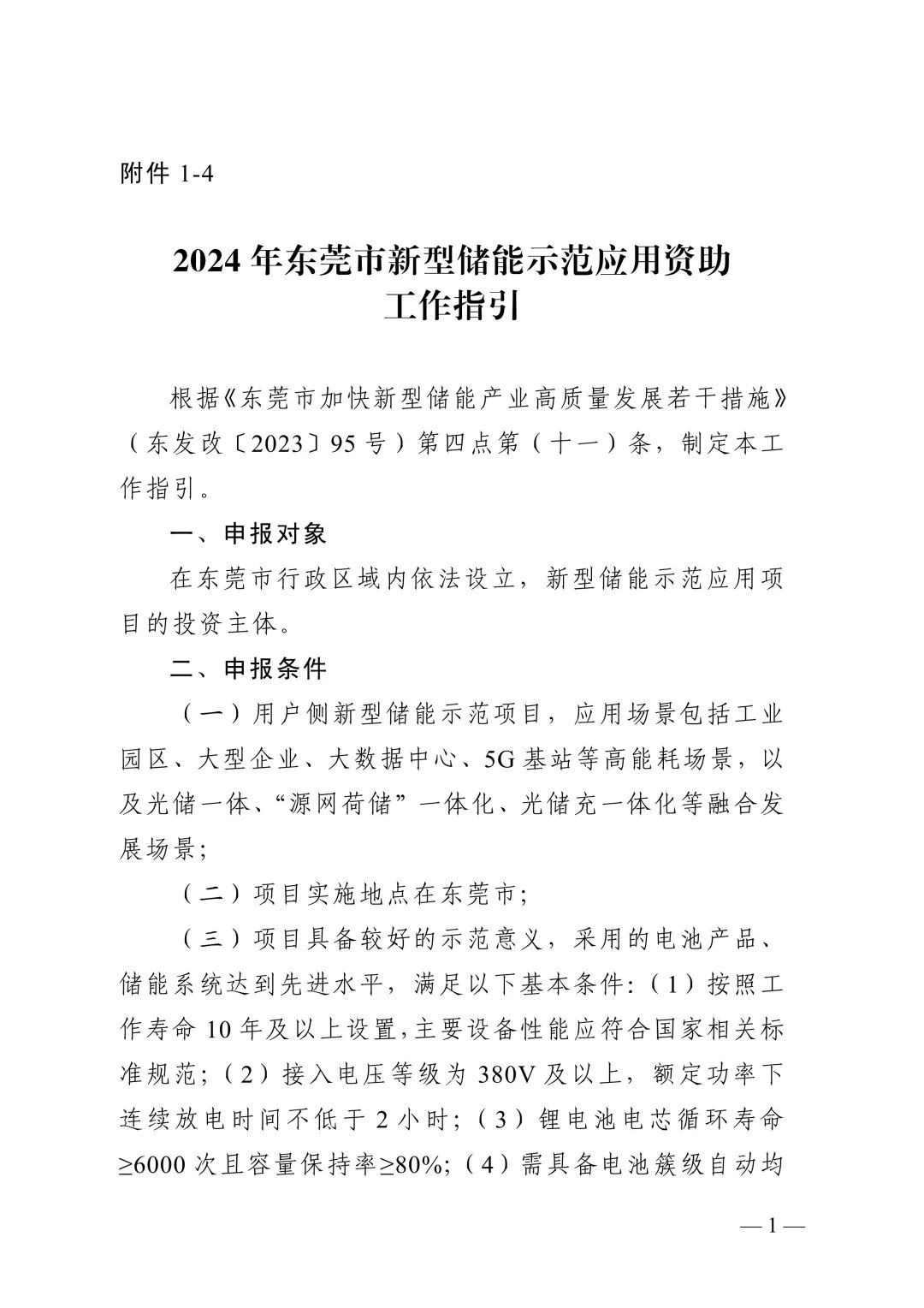 附件《2024年東莞市新型儲能示范應用資助工作指引》明確,用戶側新型儲能示范項目,自投運次月起,按經(jīng)核定的實際放電量,給予投資主體不超過0.3元/千瓦時的事后資助,補貼累計不超過2年,單個項目累計補貼不超過300萬元。應用場景包括工業(yè)園區(qū)、大型企業(yè)、大數(shù)據(jù)中心、5G基站等高能耗場景,以及光儲一體、“源網(wǎng)荷儲”一體化、光儲充一體化等融合發(fā)展場景。