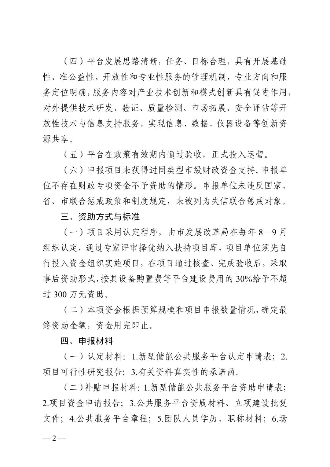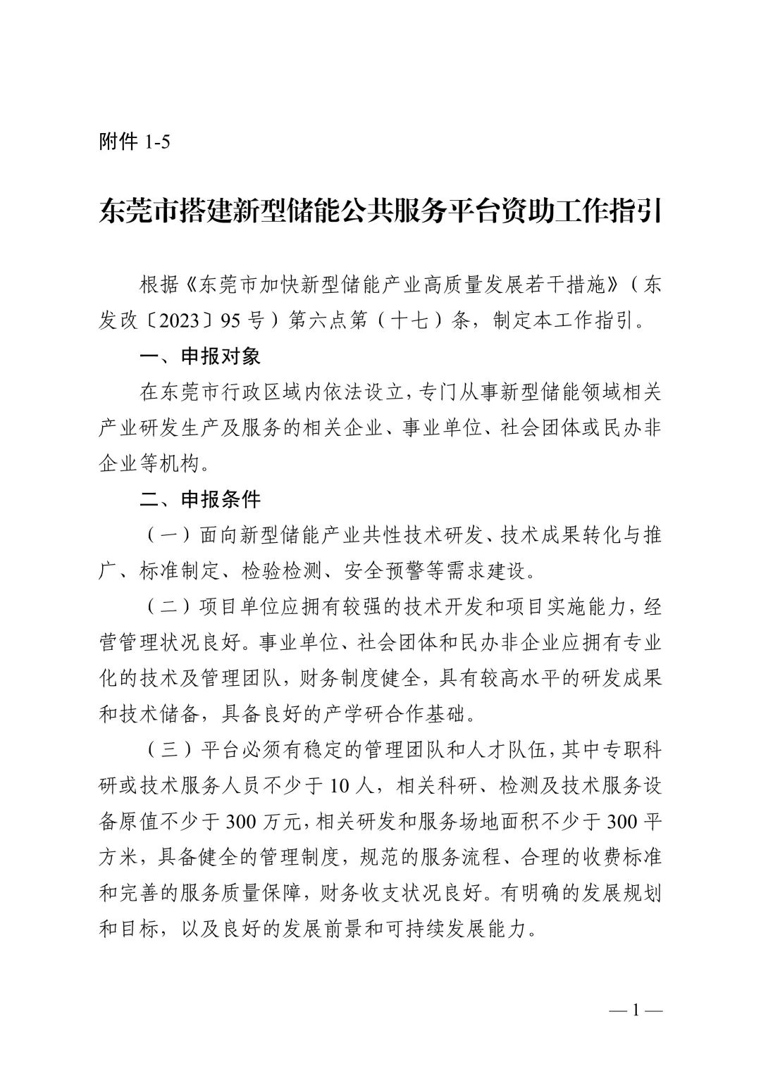 東莞市搭建新型儲能公共服務平臺資助工作指引,面向新型儲能產(chǎn)業(yè)共性技術研發(fā)、技術成果轉化與推廣、標準制定、檢驗檢測、安全預警等需求建設。在項目通過核查、完成驗收后,采取事后資助形式,按其設備購置費等平臺建設費用的30%給予不超過300萬元資助。