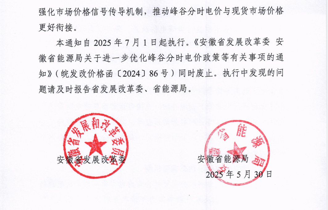 中國儲能網(wǎng)訊:5月30號,安徽省發(fā)展改革委安徽省能源局關(guān)于進(jìn)一步完善工商業(yè)峰谷分時電價政策有關(guān)事項的通知(和征求意稿一致)