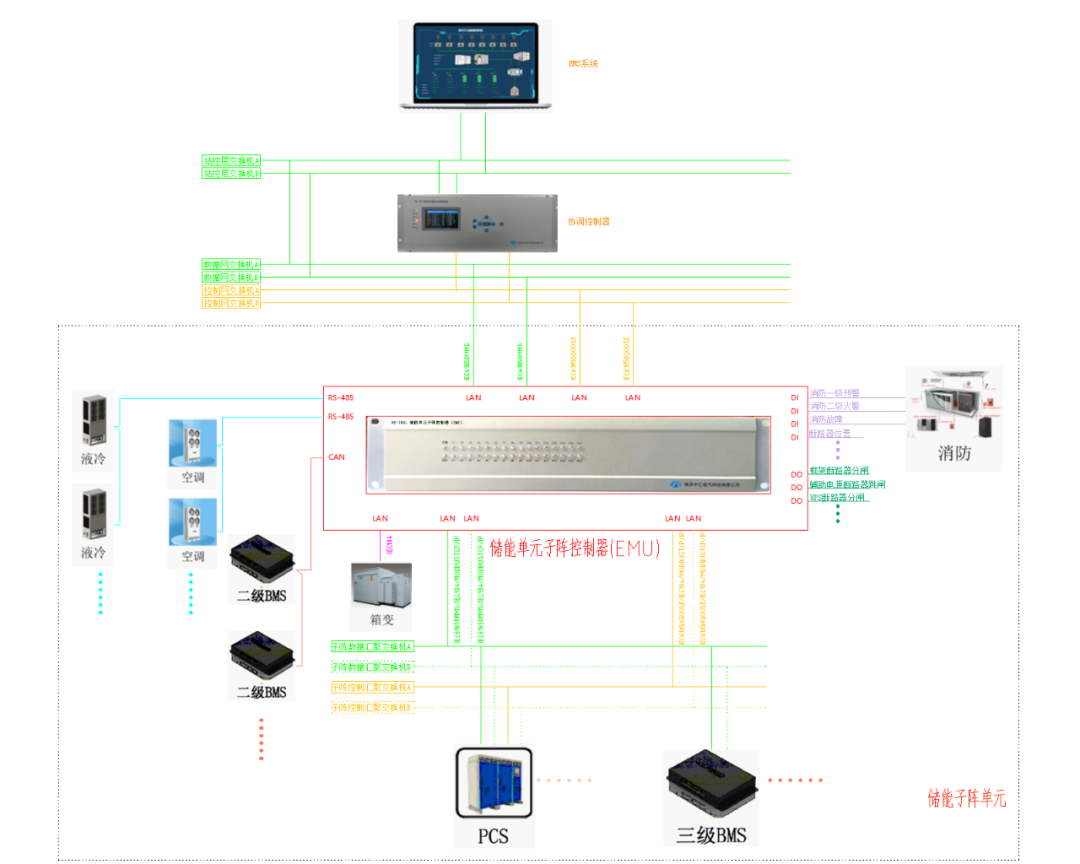 儲(chǔ)能單元子陣控制器(EMU)是儲(chǔ)能系統(tǒng)中負(fù)責(zé)對(duì)儲(chǔ)能單元子陣進(jìn)行監(jiān)測(cè)、控制和管理的關(guān)鍵設(shè)備,是提升儲(chǔ)能系統(tǒng)效率、安全性與經(jīng)濟(jì)性的核心樞紐。在保障儲(chǔ)能系統(tǒng)安全、穩(wěn)定、高效運(yùn)行方面發(fā)揮著重要作用。儲(chǔ)能單元子陣控制(EMU)設(shè)計(jì)兼顧實(shí)時(shí)性、可靠性與靈活性,適應(yīng)復(fù)雜多變的能源管理需求。
