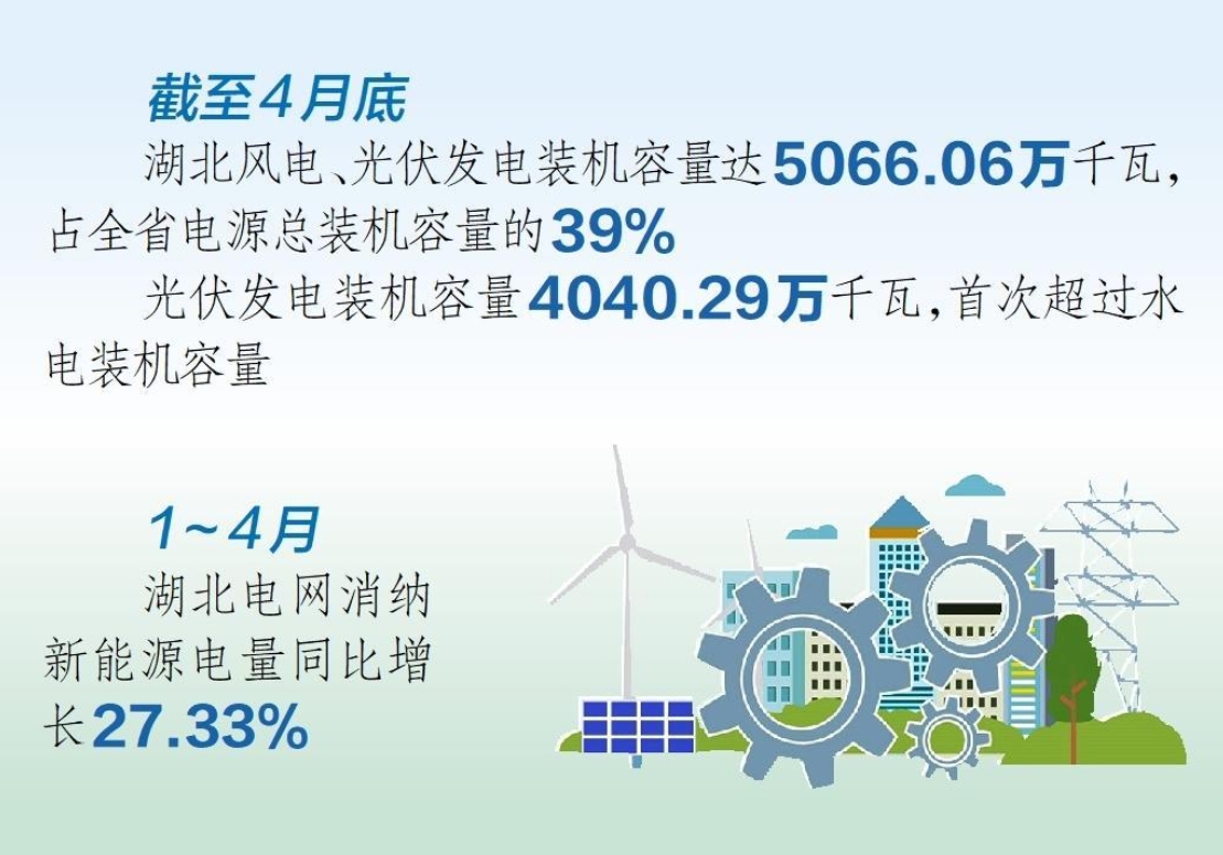 中國(guó)儲(chǔ)能網(wǎng)訊:5月15日從國(guó)網(wǎng)湖北省電力有限公司獲悉,截至4月底,湖北風(fēng)電、光伏發(fā)電裝機(jī)容量達(dá)5066.06萬(wàn)千瓦,占全省電源總裝機(jī)容量的39%。其中,光伏發(fā)電裝機(jī)容量4040.29萬(wàn)千瓦,首次超過水電裝機(jī)容量。