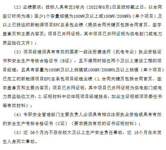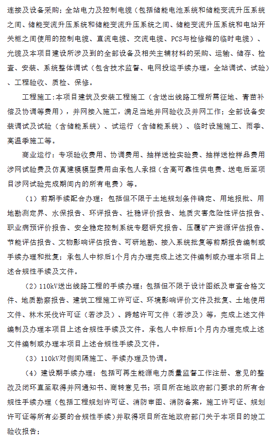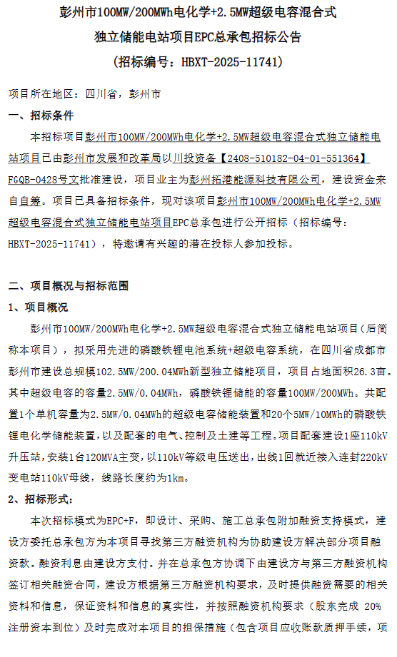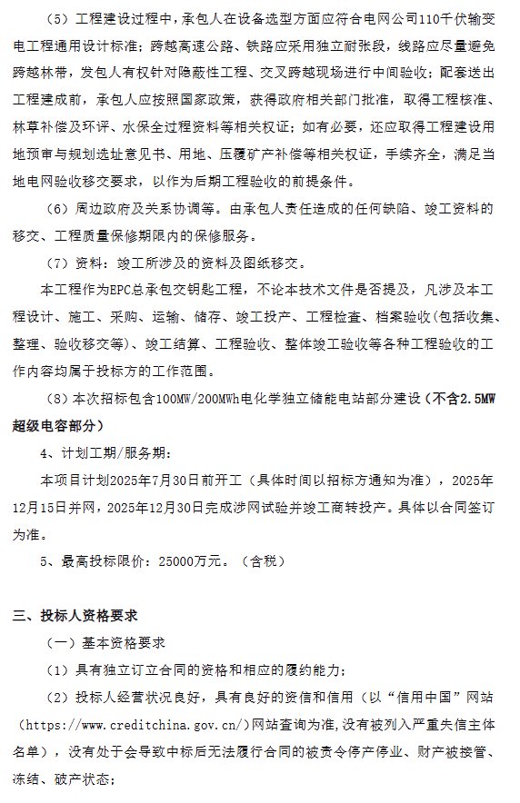 本次招標(biāo)包含100MW/200MWh電化學(xué)獨立儲能電站部分建設(shè)(不含2.5MW超級電容部分)。計劃2025年7月30日前開工,2025年12月15日并網(wǎng),2025年12月30日完成涉網(wǎng)試驗并竣工商轉(zhuǎn)投產(chǎn)。具體以合同簽訂為準(zhǔn)。