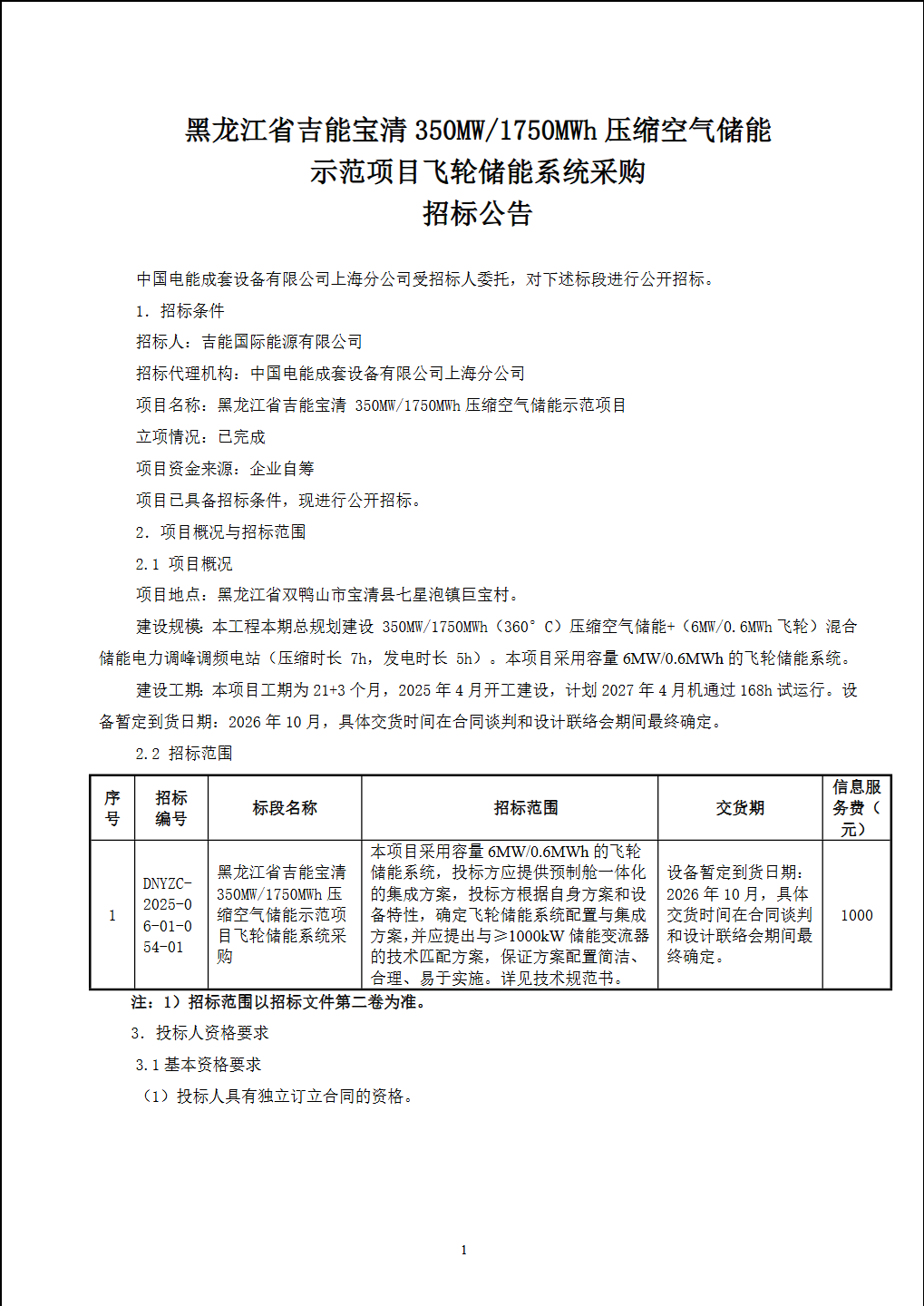 350MW/1750MWh!黑龍江寶清壓縮空氣儲能示范項目飛輪儲能系統(tǒng)采購招標公告
