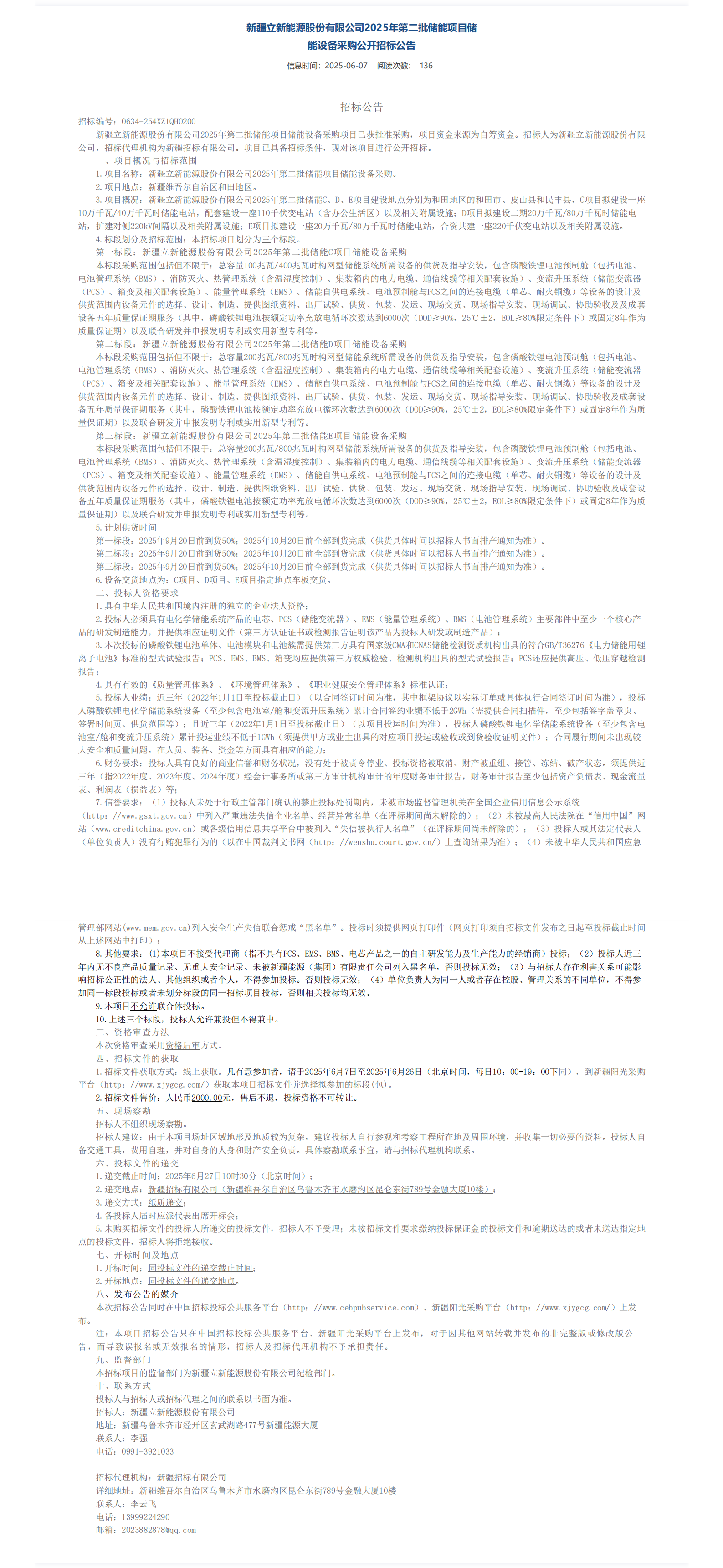中國(guó)儲(chǔ)能網(wǎng)訊:6月7日,新疆立新能源股份有限公司2025年第二批儲(chǔ)能項(xiàng)目?jī)?chǔ)能設(shè)備采購(gòu)公告發(fā)布,采購(gòu)新疆和田地區(qū)三個(gè)項(xiàng)目共500MW/2000MWh構(gòu)網(wǎng)型儲(chǔ)能設(shè)備。