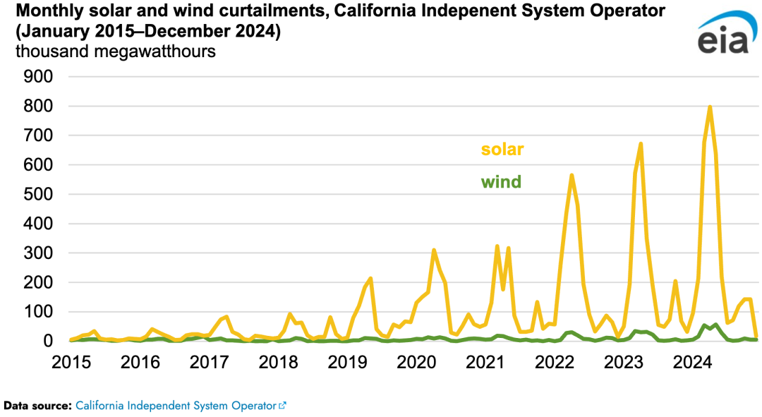 中國(guó)儲(chǔ)能網(wǎng)訊:據(jù)美國(guó)能源信息署 (EIA)的數(shù)據(jù),加州獨(dú)立系統(tǒng)運(yùn)營(yíng)商(CAISO,負(fù)責(zé)加州大部分地區(qū)的電網(wǎng)運(yùn)營(yíng))在平衡供需的同時(shí),隨著可再生能源裝機(jī)容量的快速增長(zhǎng),越來(lái)越多地削減太陽(yáng)能和風(fēng)能發(fā)電。
