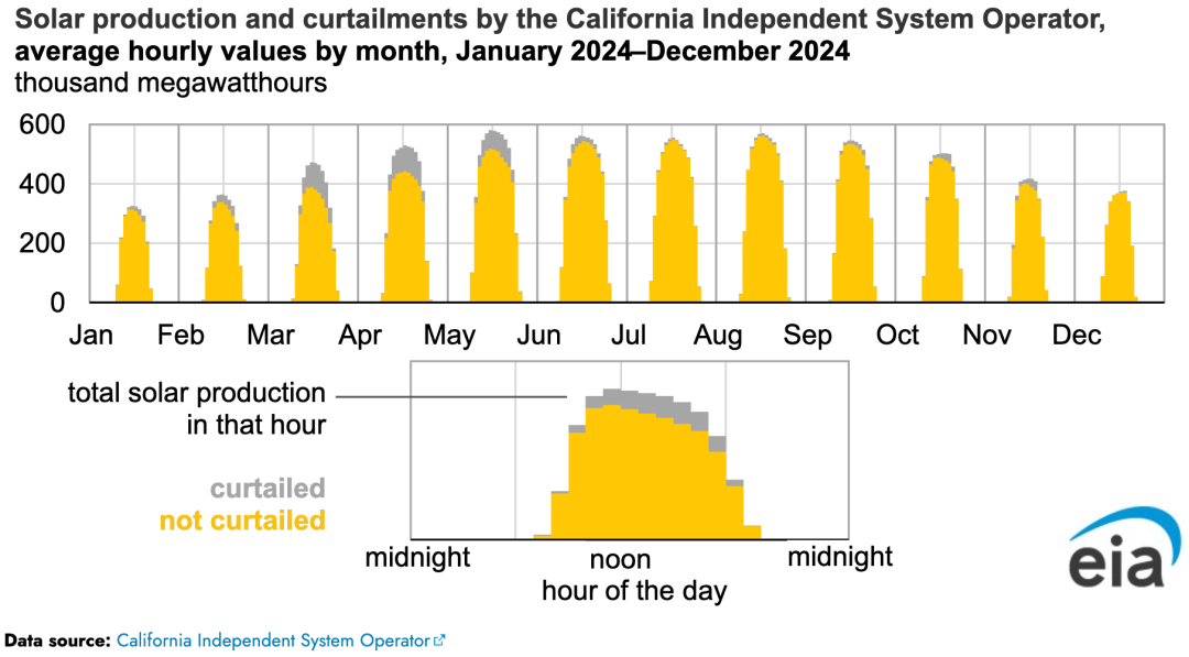 2024 年CAISO 削減了 340 萬(wàn)兆瓦時(shí)的公用事業(yè)規(guī)模風(fēng)能和太陽(yáng)能發(fā)電,比 2023 年削減的電量增加了 29%。太陽(yáng)能占 2024 年 CAISO 削減總電量的 93%。CAISO 在春季削減的太陽(yáng)能最多,當(dāng)時(shí)太陽(yáng)能發(fā)電量相對(duì)較高,而用電需求相對(duì)較低,因?yàn)闇睾偷拇杭練鉁匾馕吨鴮?duì)空間供暖或空調(diào)的需求較少。