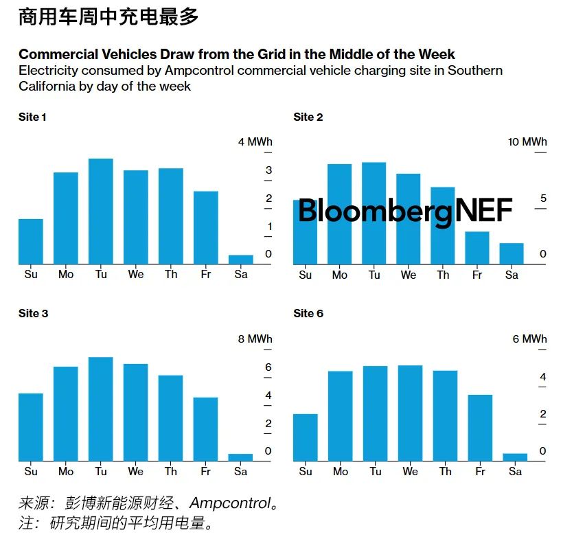 本研究中的六個(gè)充電站在六個(gè)月內(nèi)用電3.4GWh,約相當(dāng)于680個(gè)美國家庭同期的用電量。最高峰時(shí),最大充電站的用電量達(dá)到13.4MWh,約相當(dāng)于23棟寫字樓的日用電量。
