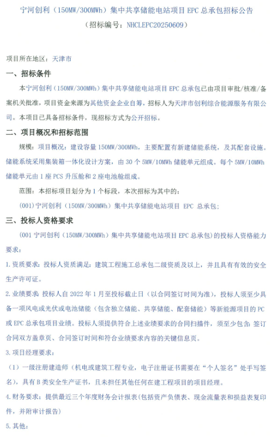 中國儲能網(wǎng)訊:6月9日,天津?qū)幒觿?chuàng)利150MW/300MWh集中共享儲能電站EPC招標。項目資金來源為企業(yè)自籌,招標人為天津市創(chuàng)利綜合能源服務(wù)有限公司。