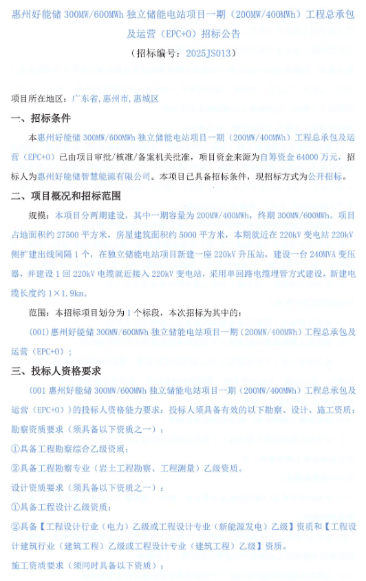 本招標(biāo)項(xiàng)目劃分為1個標(biāo)段,本次招標(biāo)為其中的:(001)惠州好能儲300WW/600MWh獨(dú)立儲能電站項(xiàng)目一期(200MT/400MWh)工程總承包及運(yùn)營(EPC+O)。