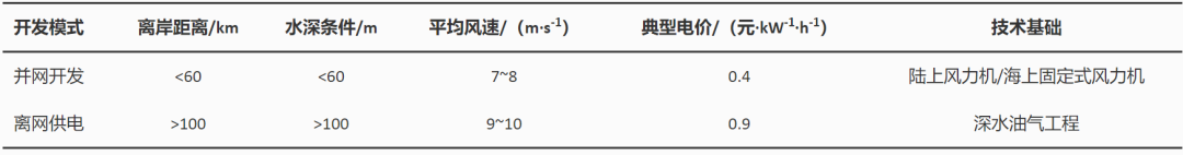 在現(xiàn)階段,我國海上風(fēng)電項(xiàng)目集中在近海淺水區(qū)。為了適應(yīng)海上風(fēng)電走向深遠(yuǎn)海的發(fā)展形勢,需要借鑒海上油氣平臺方面的成熟經(jīng)驗(yàn),開展深遠(yuǎn)海浮式風(fēng)電多類基礎(chǔ)形式的應(yīng)用研究。我國投產(chǎn)的深遠(yuǎn)海浮式風(fēng)力機(jī)基礎(chǔ)形式以半潛型為主(見表1),高性能、經(jīng)濟(jì)型的TLP型基礎(chǔ)也獲得廣泛關(guān)注。我國浮式風(fēng)電的開發(fā)模式有并網(wǎng)開發(fā)、離網(wǎng)供電兩類(見表2)。以陸上風(fēng)力機(jī)設(shè)計(jì)經(jīng)驗(yàn)、近海固定式風(fēng)力機(jī)建設(shè)經(jīng)驗(yàn)為基礎(chǔ)的浮式海上風(fēng)電開發(fā)模式主要適用于近岸項(xiàng)目,而深遠(yuǎn)海風(fēng)能開發(fā)模式需要持續(xù)探索和積累。離網(wǎng)供電、多能協(xié)采是現(xiàn)階段國內(nèi)漂浮式風(fēng)電實(shí)現(xiàn)盈利開發(fā)的有益探索,如中國海洋石油集團(tuán)有限公司借鑒深水工程經(jīng)驗(yàn),建設(shè)了水深>100 m、離岸距離>100 km的離網(wǎng)深水浮式風(fēng)力機(jī)示范項(xiàng)目(“海油觀瀾號”),實(shí)現(xiàn)海上風(fēng)電與海上油氣多能協(xié)采。此外,突破跨海輸電技術(shù)以滿足深遠(yuǎn)海的電力遠(yuǎn)距離輸送要求,模塊化多級變頻器、電能存儲系統(tǒng)、非并網(wǎng)應(yīng)用系統(tǒng)等技術(shù)可為深遠(yuǎn)海浮式風(fēng)電場的開發(fā)模式提供新思路。