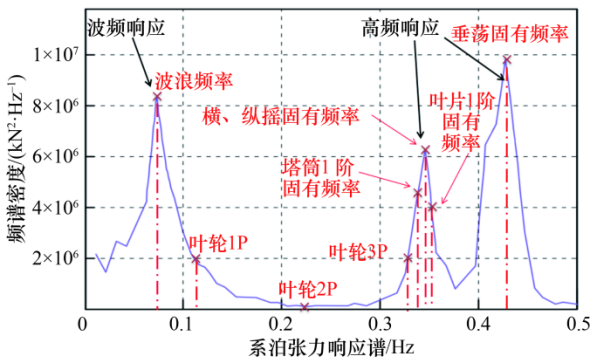 對于張力腿浮式油氣平臺,共振現(xiàn)象主要體現(xiàn)在風(fēng)浪環(huán)境載荷與系泊系統(tǒng)的耦合振動上,相關(guān)的振動響應(yīng)求解方法、工程設(shè)計(jì)軟件、水池試驗(yàn)較成熟。而在浮式風(fēng)電領(lǐng)域,張力腿式基礎(chǔ)不僅需要應(yīng)對風(fēng)浪環(huán)境載荷激勵(lì),而且需要考慮固有周期<5 s的多種高頻共振成分,如風(fēng)力機(jī)葉輪3P、塔筒1階固有頻率、葉片1階固有頻率、基礎(chǔ)縱搖/橫搖固有頻率、垂蕩固有頻率等。為此,張力腿浮式風(fēng)電機(jī)組仿真分析應(yīng)采用一體化全耦合技術(shù),以充分掌握共振響應(yīng)特性并揭示共振機(jī)理。在此基礎(chǔ)上,研究避免或者抑制張力腿浮式風(fēng)力機(jī)高頻共振的設(shè)計(jì)方法,以更好指導(dǎo)實(shí)際工程設(shè)計(jì);采用一體化全耦合方法,分析張力腿浮式基礎(chǔ)系泊的張力響應(yīng)譜,以直觀展示此類基礎(chǔ)與風(fēng)力機(jī)之間的復(fù)雜共振特性(見圖3)。